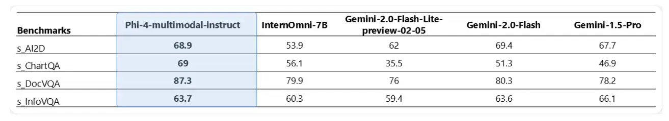 得益于其综合视觉和音频输入的能力,Phi-4 在需要图表/表格理解和文档推理的任务中表现出色。基准测试表明,与其他最先进的多模态模型相比,Phi-4 的准确性更高,尤其是在结构化数据解释方面。