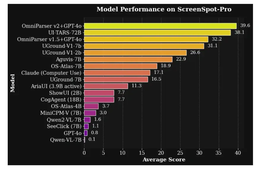与前代产品相比,OmniParser V2 进行了重大升级。它将延迟减少了 60%,并提高了准确性,尤其是在检测较小的元素时。在 ScreenSpot Pro 等测试中,与 GPT-4o 搭配使用的 OmniParser V2 的平均准确率达到了 39.6%,与 0.8% 的基准分数相比有了巨大的飞跃。这些进步得益于在一个更大、更详细的数据集上进行的训练,该数据集包含有关图标及其功能的丰富信息。