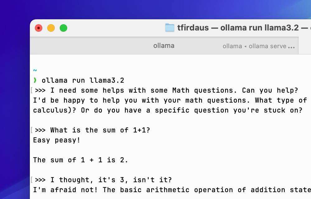 下载完成后,我们就可以在终端上开始与它交互了。它将为您提供一个输入提示,然后模型将根据您的输入生成响应。