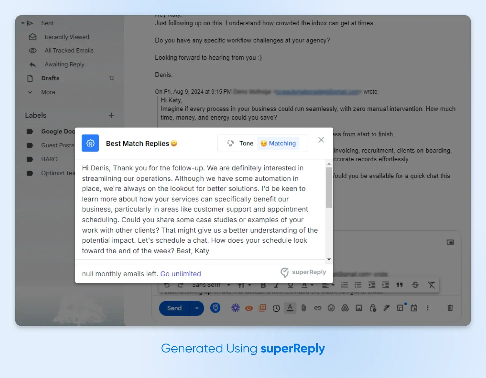 Superhuman、superReply 和 Gmail 自带的 Smart Compose 都使用人工智能在几秒钟内编写电子邮件草稿。它们甚至可以“阅读”对话中的前一封邮件,并根据上下文撰写回复。有些还允许你选择想要的语气。