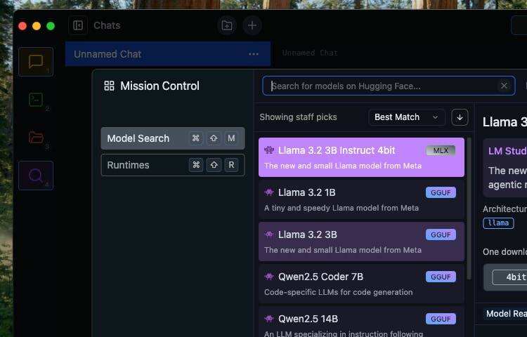 LM Studio支持多种模型,包括 GPT-3、Llama-3、Phi-3 等。您可以从侧边栏的“Discover”部分轻松下载模型。在这里,您将看到可用模型的列表、参数大小及其专业化程度。