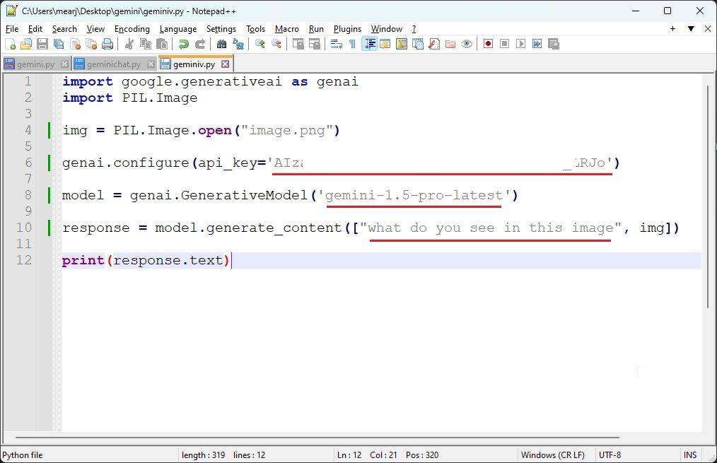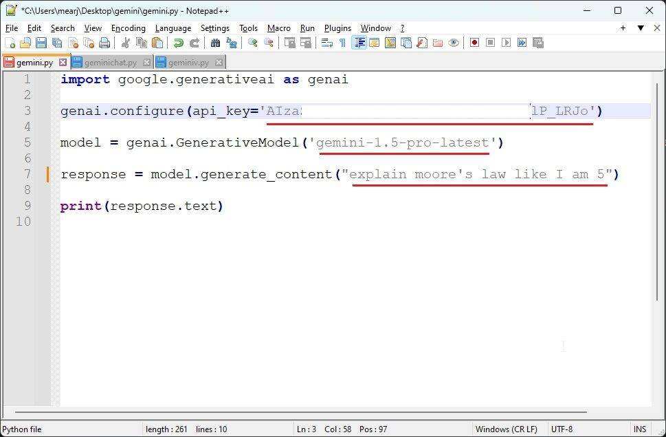 - 在这里,我将模型定义为 gemini-1.5-pro-latest,并使用了自己的 API 密钥。在下一行,你可以设置你的问题。