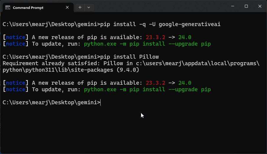 - 然后,启动终端并运行以下命令来安装 Gemini 的依赖项和处理图像的 Pillow。