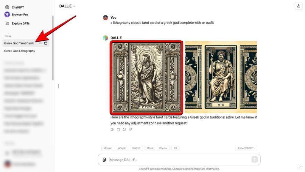 - 首先在网页浏览器上启动 ChatGPT。然后从左侧边栏中选择您创建了图片并希望修改的对话。如果尚未创建,请输入一个新的提示来描述您希望生成的图片。