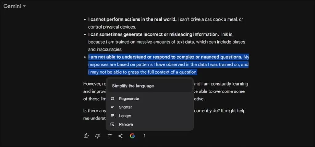 虽然修改回复选定部分的功能仅限于 Gemini 网络应用程序,但您仍然可以在使用手机应用程序时修改回复。需要注意的一点是,选择任何一个修改选项都会更改整个回复,而不是您想要的部分。