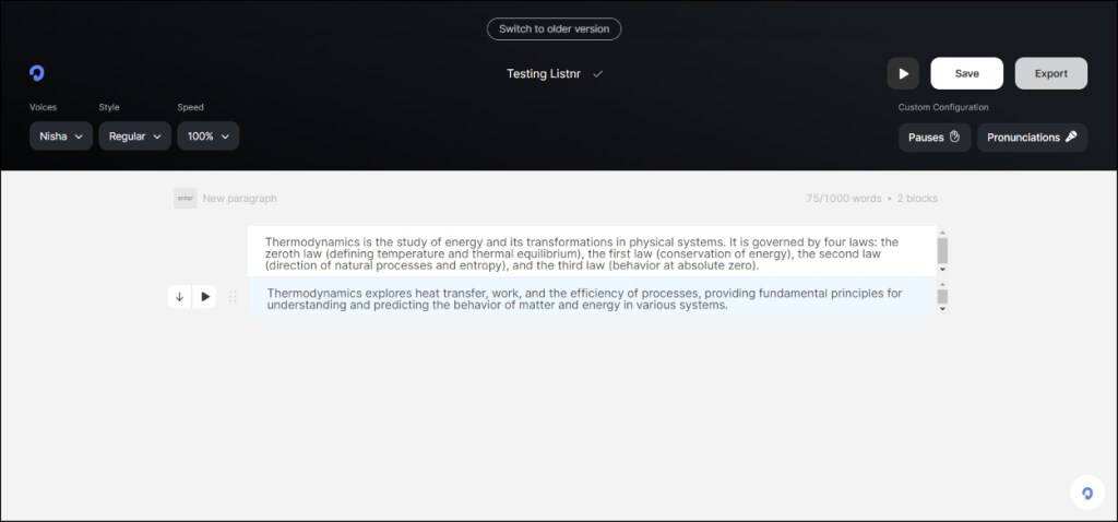 我很喜欢用这款工具创建的音频。你还可以将 Listnr 嵌入到你的博客中,因为它可以像 Play.HT 一样与 WordPress 配合使用,这样你就可以像听音频博客一样听文章了。与其他人工智能语音生成器工具一样,它也可以让你在句子中间添加停顿并编辑单词发音。
