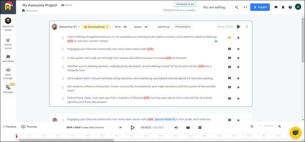 这款人工智能语音生成器甚至还能让你添加视频,并在此基础上创建自定义的人工智能配音,但在我的测试中效果并不理想。不过,我要说的是,人工智能生成的配音至少令人印象深刻。我建议喜欢对音频进行微调的用户使用 Murf.AI。