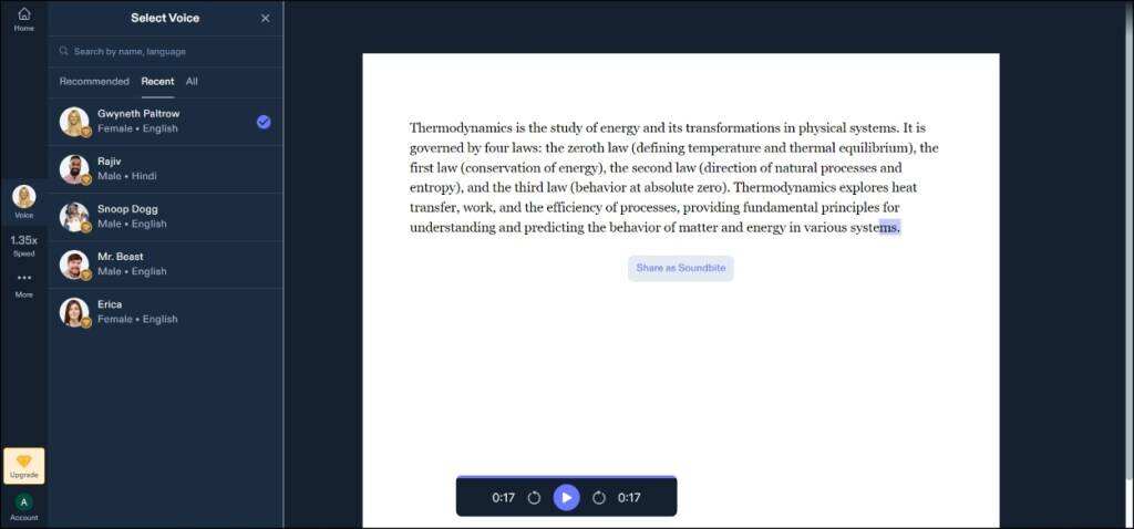 如果您需要的是多样性,那么 Listnr 将是您的不二之选。Listnr 是最大的数据库之一,拥有 900 多种语音,支持 140 多种语言和人工智能语音。不过,我确实发现高级语音比免费语音更好听,免费语音有时显得单调和机械。该工具使用起来也很简单。