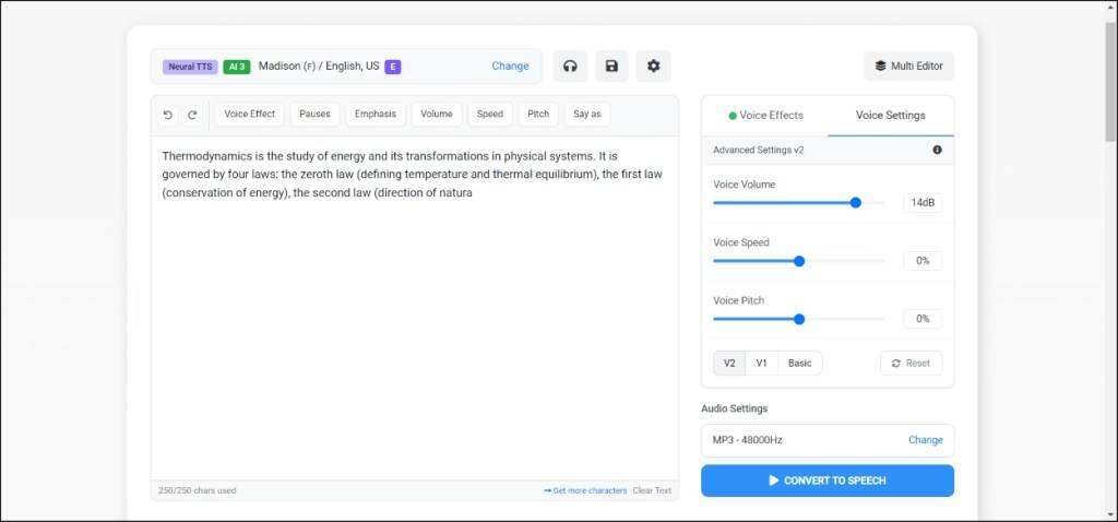 乍一看,你可能会把 Voicemaker 与标准的文本到语音工具混为一谈。但它是一款相当不错的人工智能语音生成器,非常适合初学者使用。它的神经 TTS 自带多种语音,在从文本生成逼真语音方面表现出色。虽然有时说服力稍差。你可以在不同语言、性别、情感和人工智能引擎之间进行筛选。引擎越高,效果越好,但也往往更不稳定。