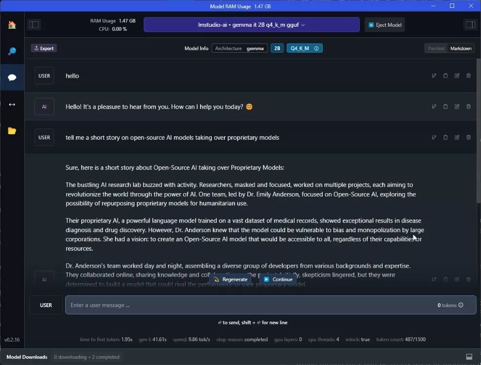 - 然后,点击 “Download”。这是一个 1.5GB 的文件,因为 Gemma 2B 模型已经过 4 位量化,以压缩模型大小并减少内存使用。如果您的内存超过 8GB,您可以下载 8 位量化模型(2.67GB),它将提供更好的性能。
