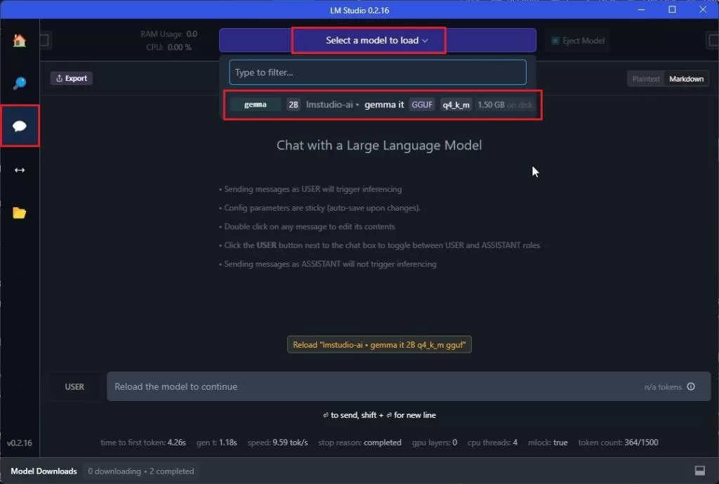 - 然后,点击 “Select a model to load” 并选择 “gemma”。它将消耗约 1.4GB 内存。