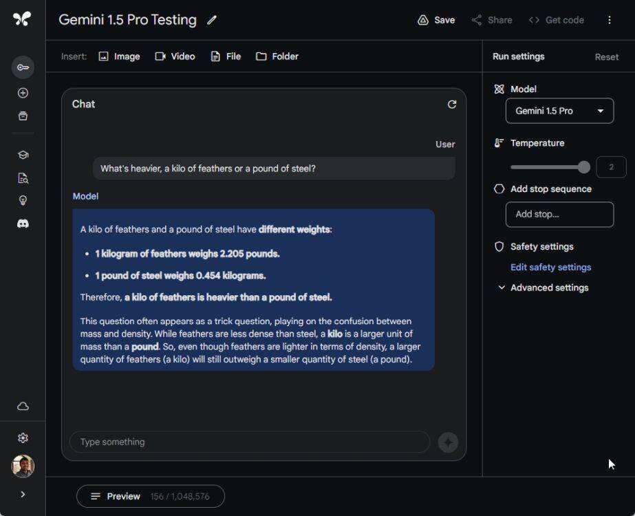 Gemini 1.5 Pro 和 GPT-4 都正确识别了单位,但没有深入研究密度,并表示包括羽毛在内的任何材料一公斤的重量总是重于一磅钢或任何东西。谷歌干得漂亮!