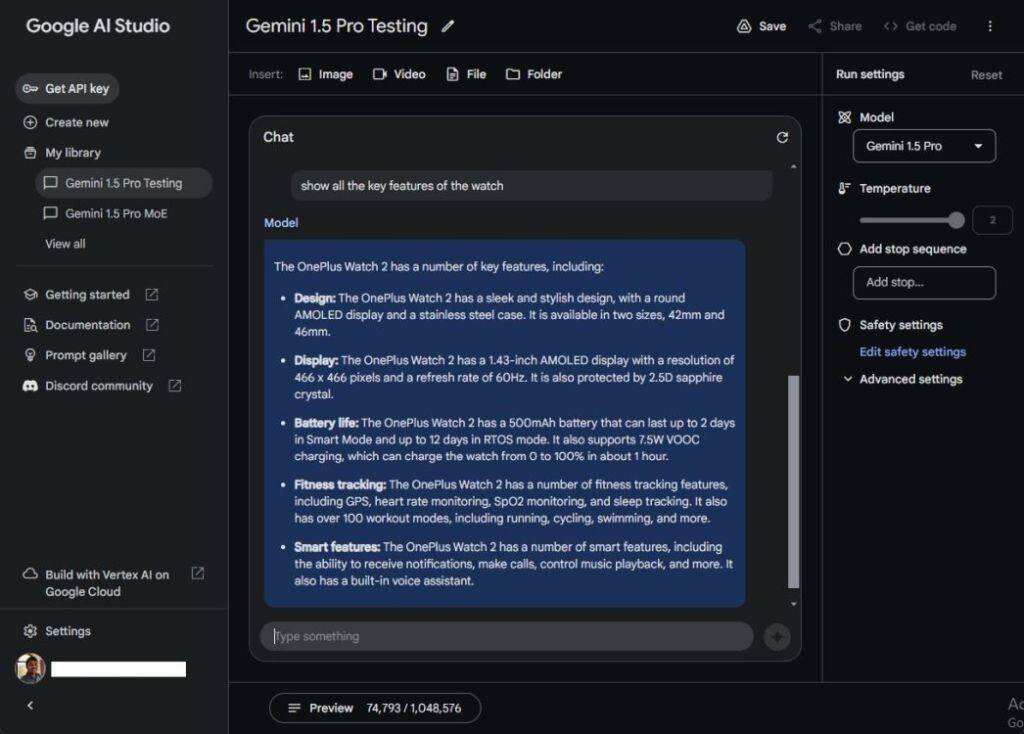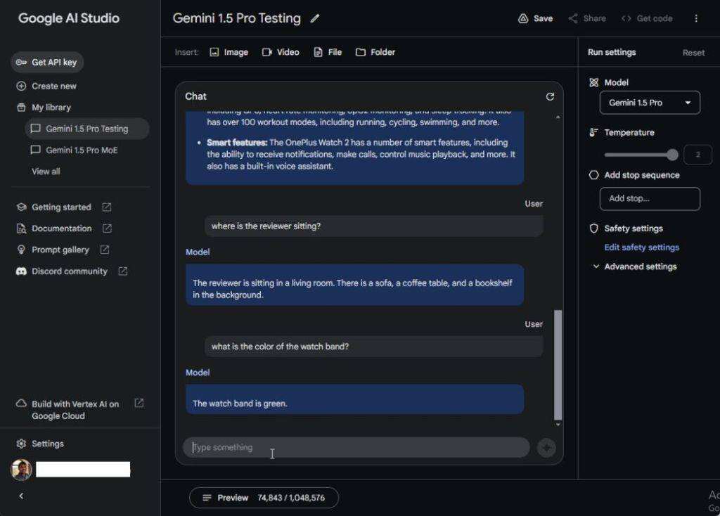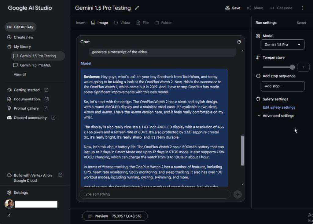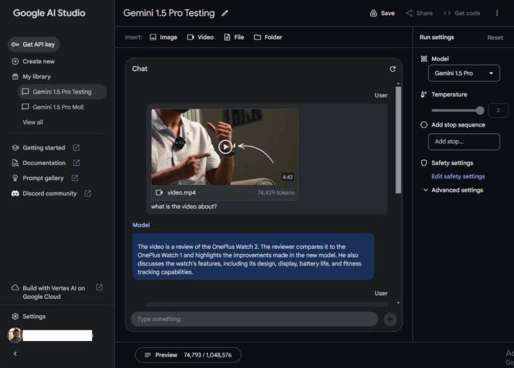 不过,我通过 Google AI Studio(访问)访问的 Gemini 1.5 Pro 除了可以上传各种文件、图片甚至由不同文件类型组成的文件夹外,还可以上传视频。因此,国外测试员上传了一段 5 分钟的 OnePlus Watch 2 评测视频(1080p,65MB),这当然不是训练数据的一部分。