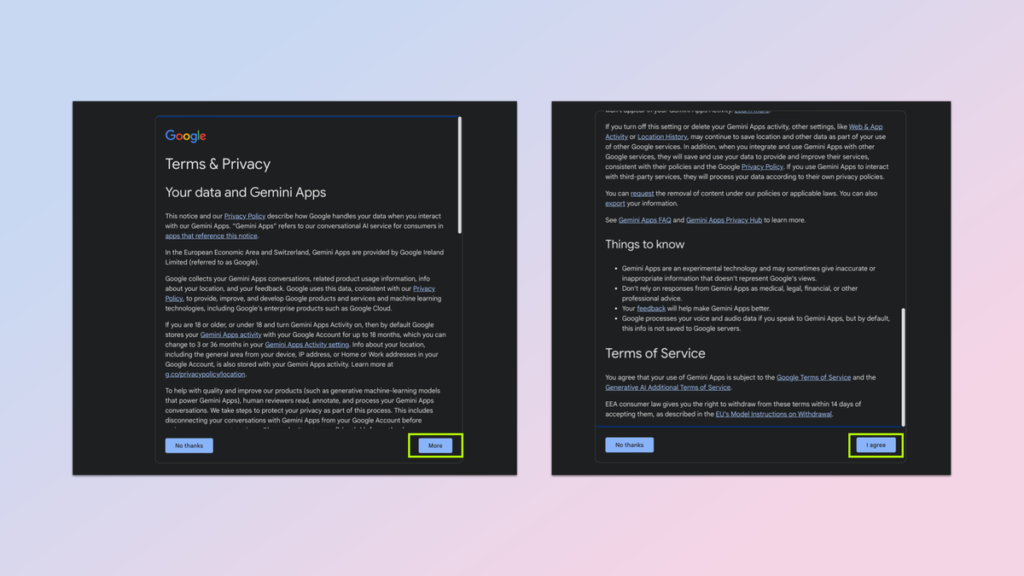现在,您需要接受 Google Gemini 服务条款。点击 more,然后在下一页点击 I agree。