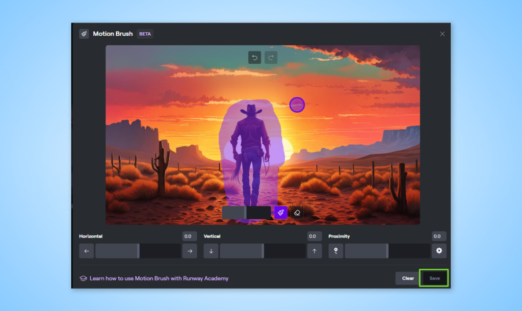 水平、垂直和邻近控制将提示人工智能在你绘制的窗口内设置运动的方向和大小。单击 “Save” 按钮即可返回。