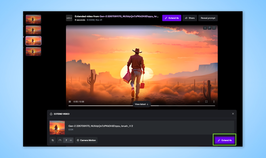 另一种方法是再延长 4 秒,最长可达 16 秒。要做到这一点,只需点击右下角的 “Extend 4s“。它将创建一个延长 4 秒的新实例。
