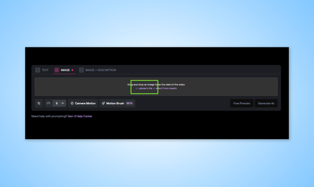 要添加一张可以制作成视频的照片,请单击 “upload a file” 从电脑中选择一张图片。在我的例子中,它就是我之前生成的牛仔图片。您也可以输入一个简单的文本提示,让 Runway 为您创建图片。