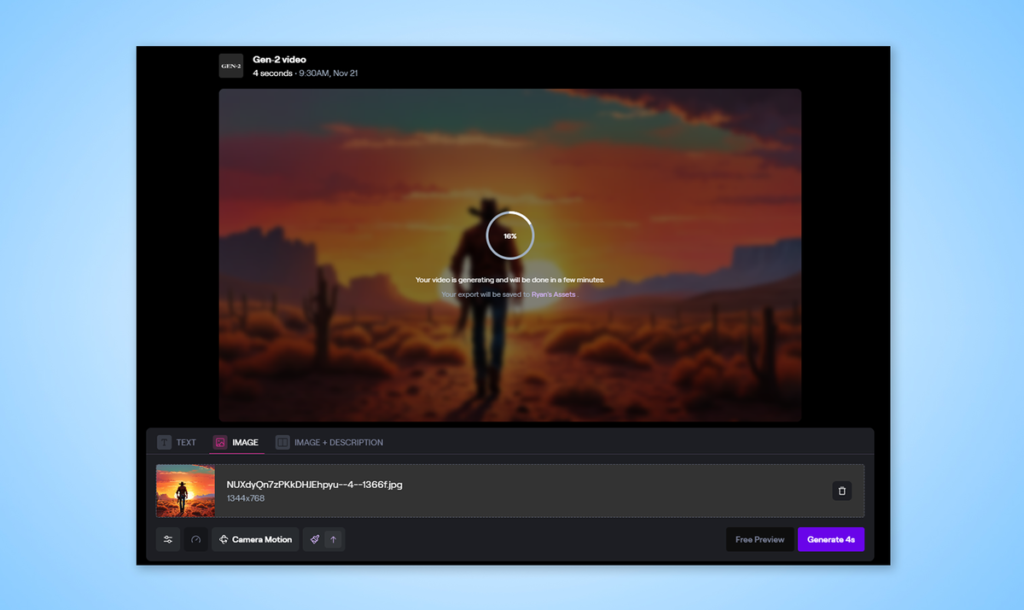 还有其他微调选项,包括如果你使用的是付费计划,则可对图像进行升频、去除水印和平滑帧。你还可以设置摄像头的运动和方向。满意后,点击 Generate 4s。这将创建您的第一个 4 秒片段。