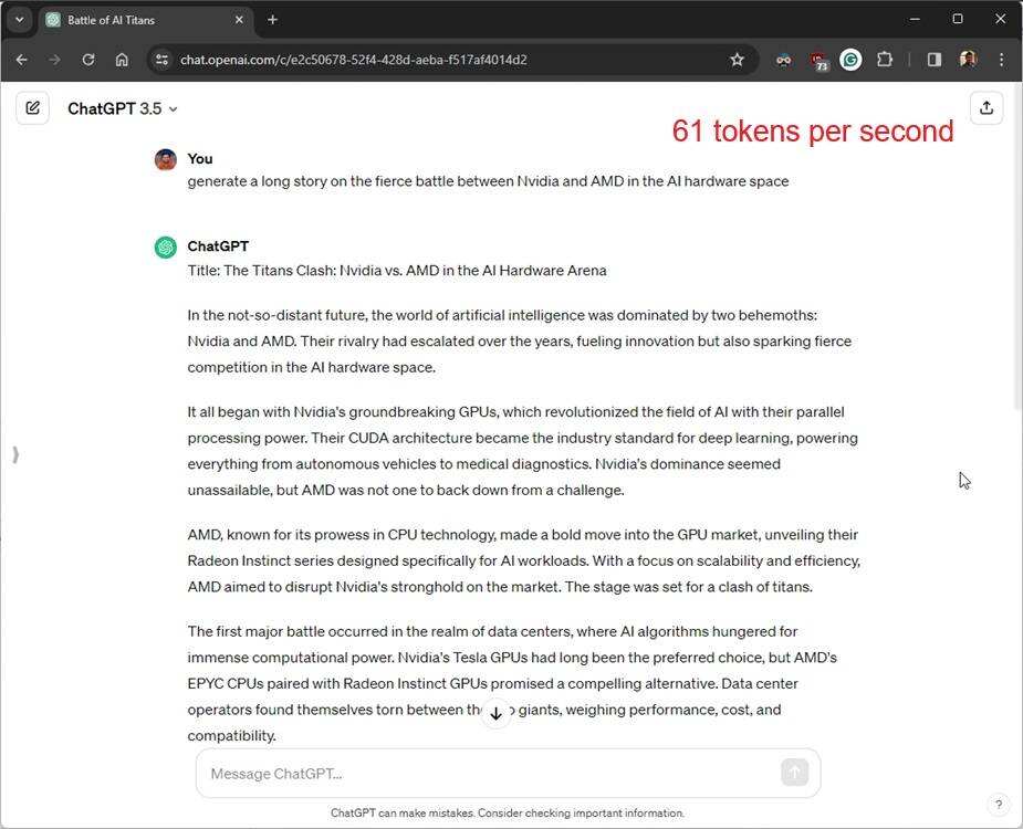 为了比较 Groq 的人工智能加速器性能,我们在 ChatGPT(GPT-3.5,175B 模型)上进行了同样的测试,并手动计算了性能指标。ChatGPT 使用了 Nvidia 最先进的 Tensor-core GPU,以每秒 61 个 token 的速度生成输出,生成 557 个 token(3090 个字符)用时 9 秒。