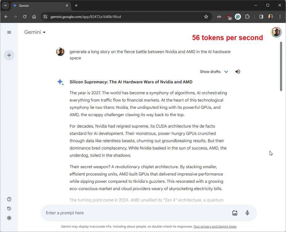 为了更好地进行比较,我们在免费版的 Gemini(由 Gemini Pro 提供支持)上进行了同样的测试,该版本在谷歌云 TPU v5e 加速器上运行。谷歌没有透露 Gemini Pro 的型号大小。其速度为每秒 56 个 token,生成 845 个 token(4428 个字符)需要 15 秒。