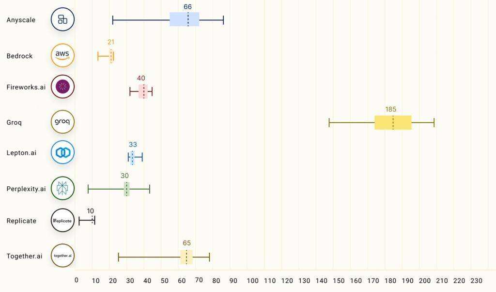 与其他服务提供商相比,ray-project 做了大量的 LLMPerf 测试,发现 Groq 的性能比其他提供商好得多。