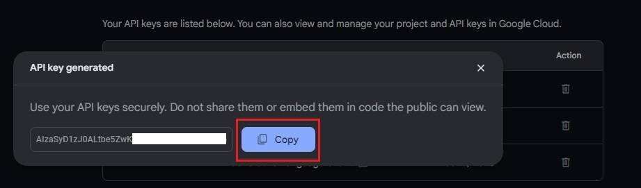 复制 API 密钥并保存。不要公开发布或共享 API 密钥。