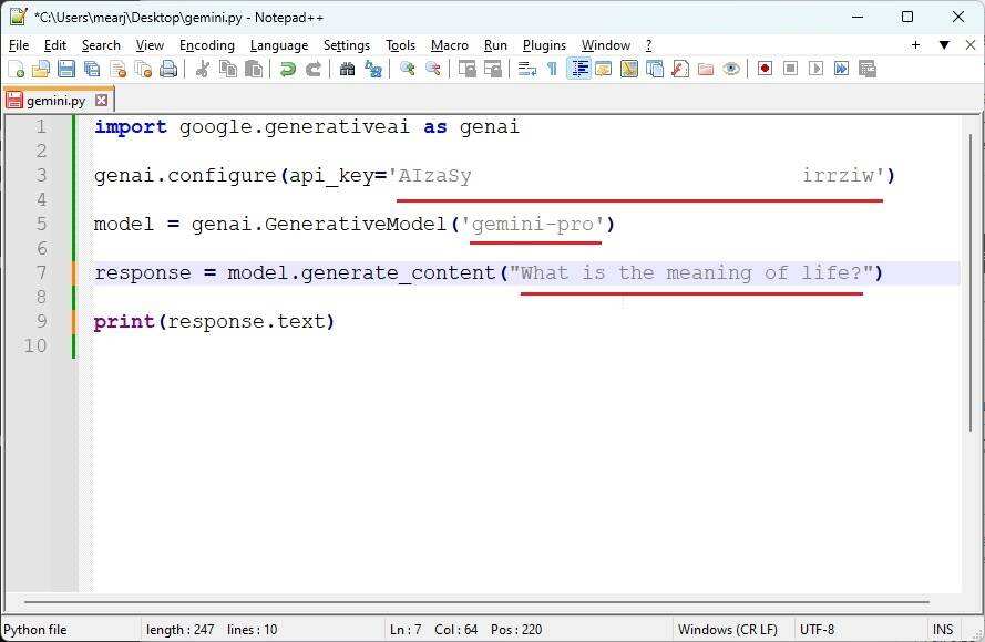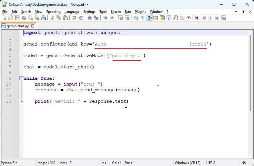 在代码编辑器中,粘贴你的 Gemini API 密钥。如您所见,我们定义了 “gemini-pro” 模型,这是一个纯文本模型。此外,我们还添加了一个可以提问的查询。