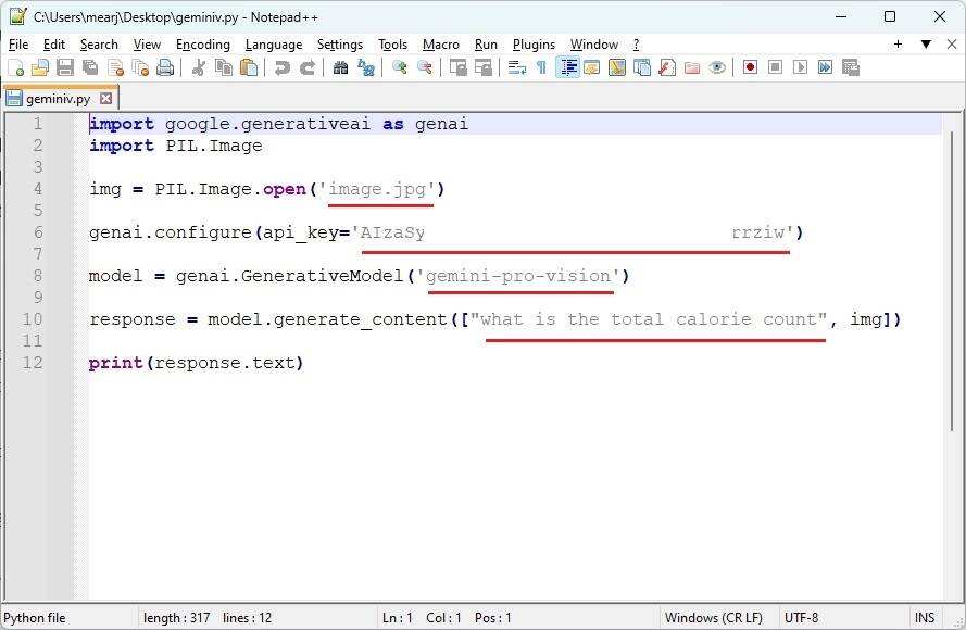 在第六行代码中,您可以提出与图片相关的问题。由于我输入的是与食物有关的图片,因此我要求 Gemini Pro 计算总卡路里数。