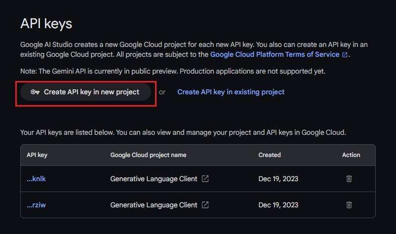 在 API 密钥下,点击 “Create API key in new project” 按钮。