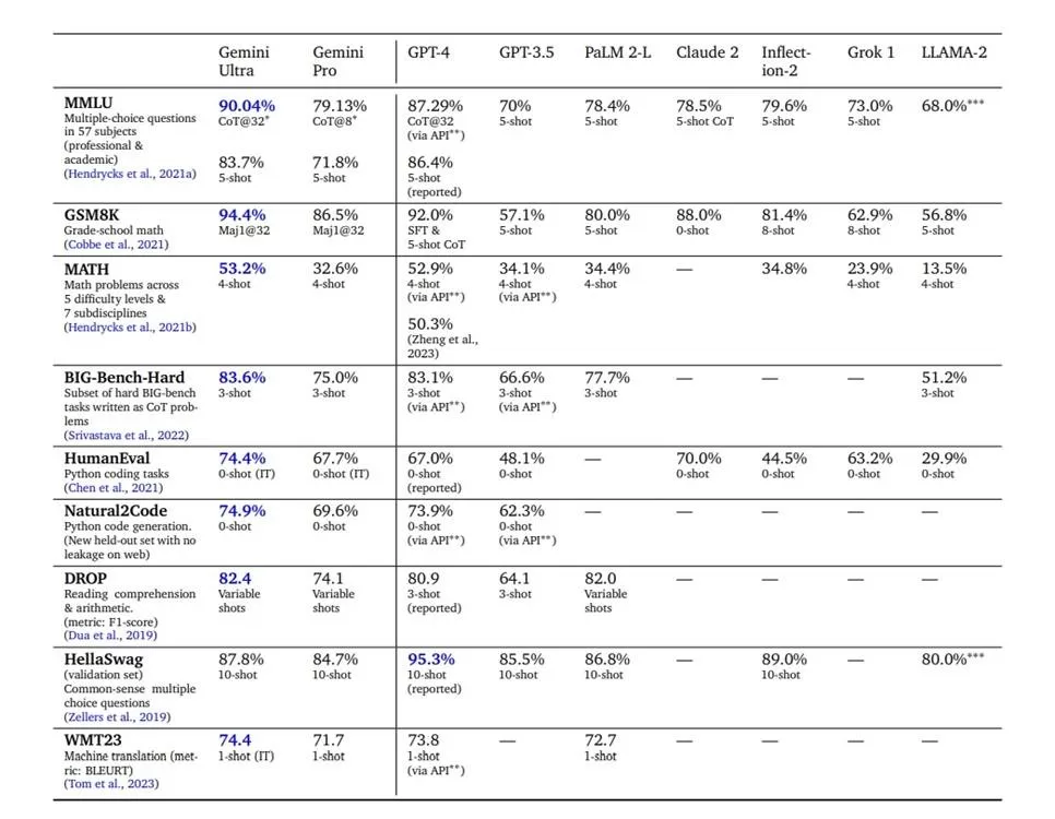 在标准的 5-shot 提示下,Gemini Ultra 的得分率降至 83.7%,而 GPT-4 的得分率为 86.4%,GPT-4 仍然是 MMLU 测试中得分最高的。