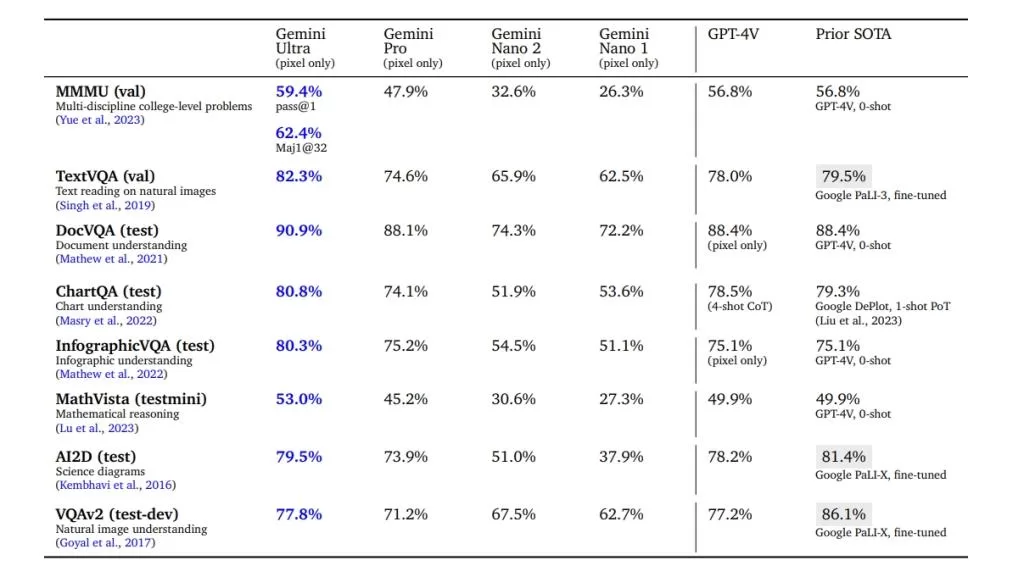 在多模式测试中,Gemini Ultra 几乎在所有方面都战胜了 GPT-4V (Vision)。在 MMMU 测试中,Gemini Ultra 得分为 59.4%,GPT-4V 得分为 56.8%。在自然图像理解(VQAv2 测试)中,Gemini Ultra 得分 77.8%,GPT-4V 得分 77.2%。接着,在自然图像 OCR 测试(TextVQA)中,Gemini Ultra 得分 82.3%,GPT-4V 得分 78%。在文档理解测试(DocVQA)中,Gemini Ultra 得分 90.9%,GPT-4V 得分 88.4%。最后,在信息图理解方面,Gemini Ultra 得分 80.3%,GPT-4V 得分 75.1%。