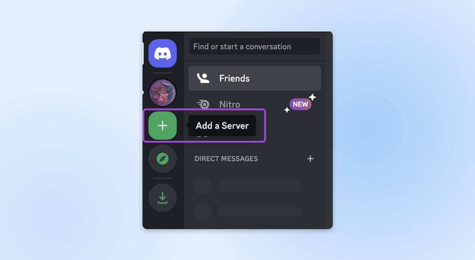 在屏幕左侧的 Discord 图标下找到服务器列表。如果你是新用户,可能还没有任何服务器。使用 “+”图标添加服务器。