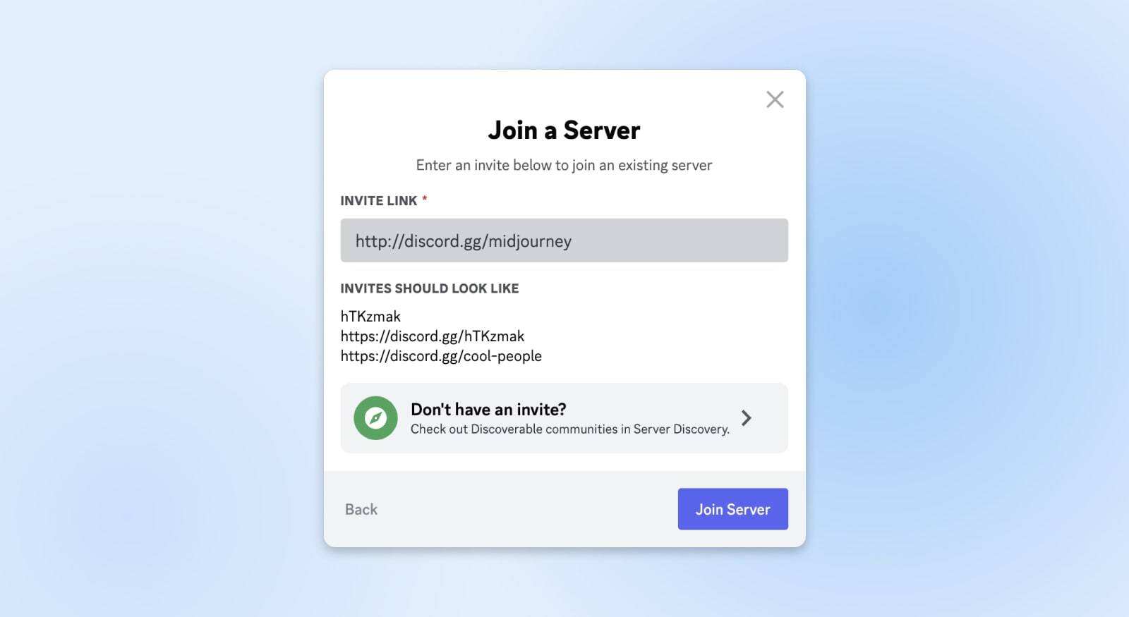您应该会看到一个 “Join a Server” 弹窗,邀请您粘贴所需的服务器链接。以下是 Midjourney 的邀请链接:http://discord.gg/midjourney