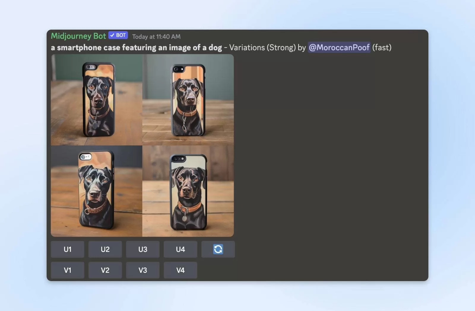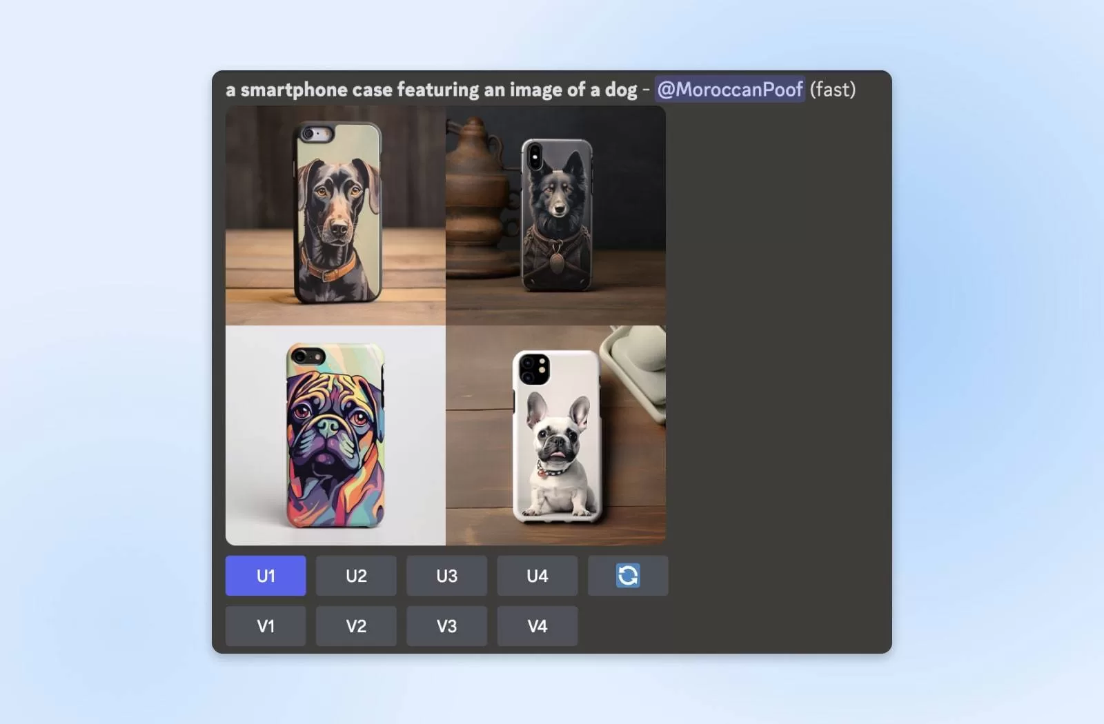 V1 V2 V3 V4:V 按钮会生成与数字相关的图形的图像变体。因此,在我们的示例中,选择 V4 就会出现一个新的网格,网格中满是以可爱的法国斗牛犬为主题的手机壳图片。