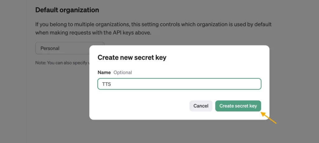 在 API 密钥页面,点击 “+ Create new secret key“,为其命名,然后点击 “Create secret key“。