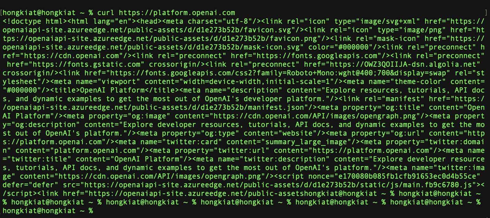 如果 cURL 设置正确且已连接互联网,它将发送 HTTP 请求以检索 platform.openai.com 的内容,你应该会看到与此截图类似的输出: