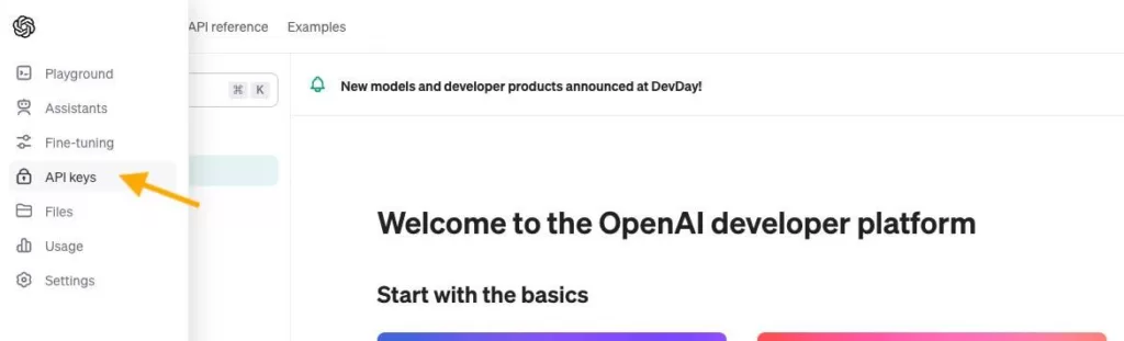 要获取 API 密钥,请先登录 openai.com,然后点击侧边栏上的 “API keys“。
