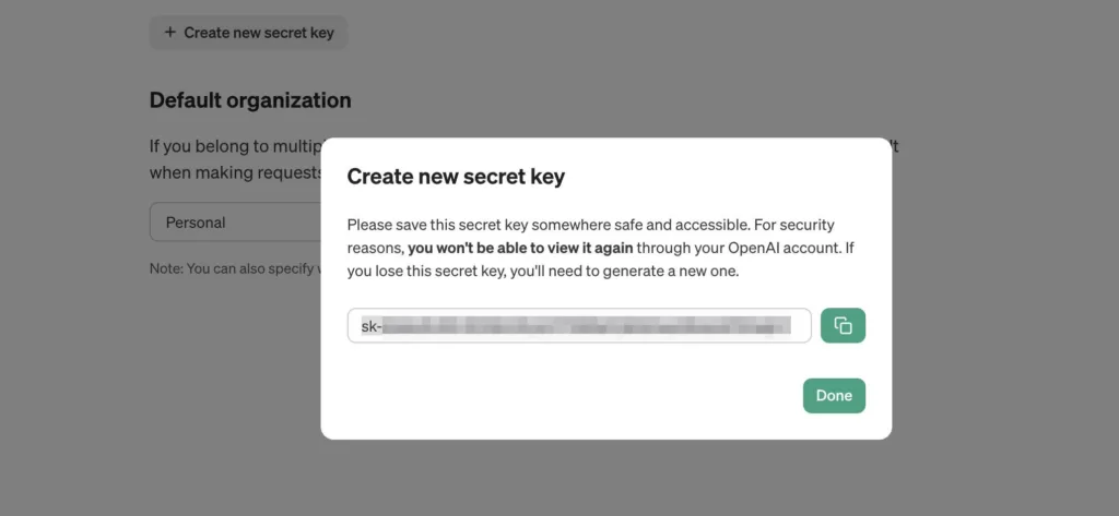 将密匙存储在安全且可访问的位置。您将无法通过 OpenAI 账户再次查看它。如果丢失了密匙,您必须创建一个新密匙。