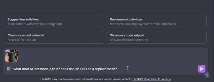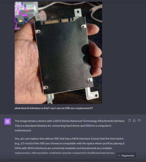 6. 例如,我上传了一个硬盘的图像,并要求它查找接口名称,以及是否可以使用固态硬盘代替。它正确识别了接口,并告诉我可以用哪种固态硬盘代替。