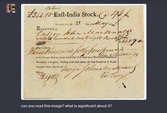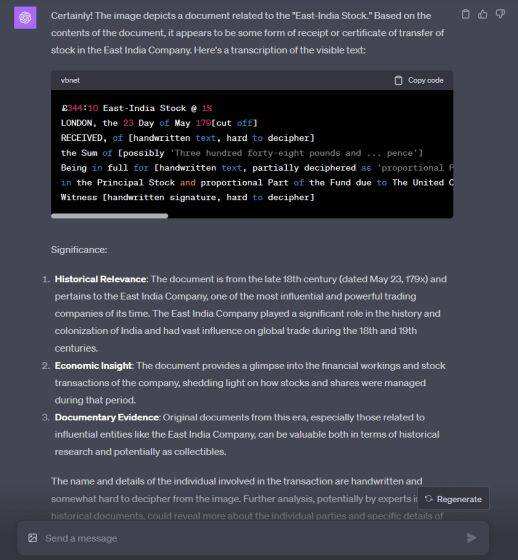 7. 还有一次,我给了它一份字迹难以辨认的历史文献,它很好地破译了其中的文字。它还详细指出了文件的重要意义。GPT-4 的视觉功能有很多不可思议的应用案例,您可以尽情探索。