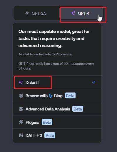 3. 将鼠标悬停在 “GPT-4” 上,会出现一个下拉菜单。确保您处于 “Default” 模式。