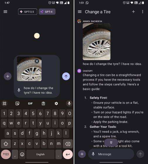 5. 我拍摄了一张汽车轮胎的实时照片,并要求 ChatGPT 解释更换轮胎的过程。