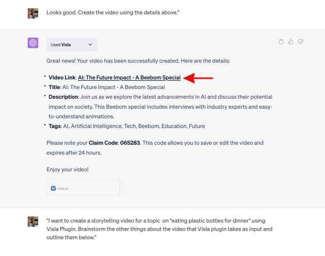 在 ChatGPT 4 中启用 Visla 插件后,键入以下提示: