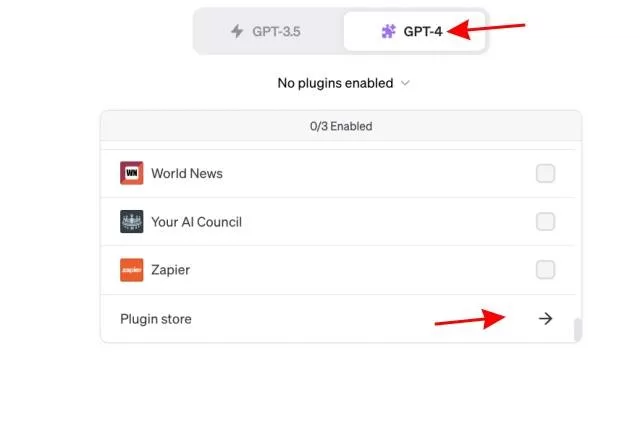 在 ChatGPT 主屏幕上,点击插件下拉菜单,然后打开 “Plugin Store“。