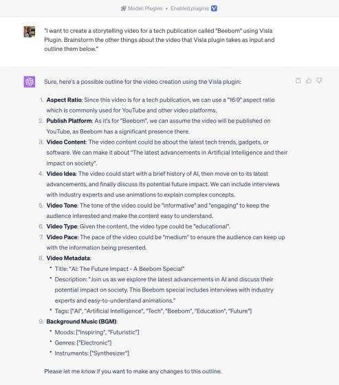 这将要求 ChatGPT 为您请求的视频创建大纲。如您所见,它非常详细。如果需要修改,请仔细阅读并提出要求。