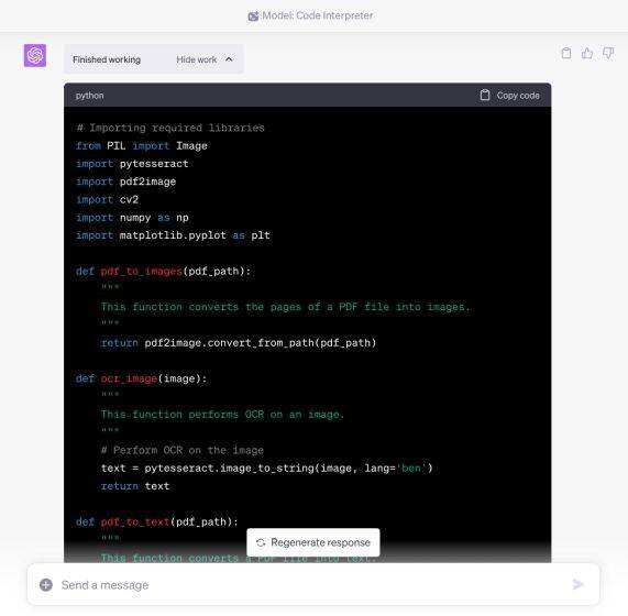 如上所述,Code Interpreter 运行 Python 代码来执行 ChatGPT 界面中的任务。因此,举例来说,如果你要求它使用 OCR 对基于图像的 PDF 文件进行搜索,它就会立即创建一个自定义 Python 脚本并在那里执行。您只需上传 PDF 文件,它就会在后台完成所有工作。你可以检查它正在使用的所有库,以及卡住的地方等等。