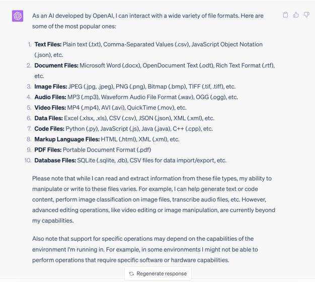 Code Interpreter 还为上传文件提供临时磁盘空间。它支持多种文件格式,包括 TXT、PDF、DOC、DOCX、JPEG、PNG、MP4、AVI、CSV、JSON、XML、XLS、XLSX、CPP、PY、HTML、PDF、DB、SQLite 等常用格式。这并不是一份详尽的列表,只是各类文件格式的流行代表。您可以在下面的推文中查看完整列表。