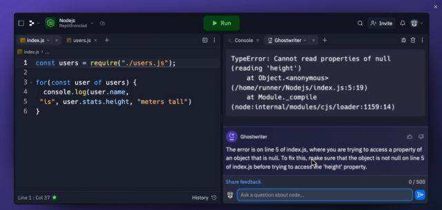 Replit还发布了名为Ghostwriter的人工智能编码工具。它由内部大型语言模型提供支持,该模型在公开代码上进行训练,并由Replit进一步调整。它支持代码补全、代码生成、转换、增强、解释、聊天、调试等功能。根据Replit的说法,它将您项目的上下文因素考虑在内,并给出相关的响应。它还能自动检测代码中的问题并提出修复建议。