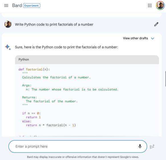 您还可以使用Google Bard将代码从一种语言翻译成另一种语言。通过一项名为 “隐式代码执行”(Implicit Code Execution)的新技术,Bard能够在后台运行代码,以准确显示输出结果。据谷歌介绍,在基于计算的提示中,新技术将Bard的准确性提高了30%。此外,您还可以在Google Colab中直接导出代码并测试输出结果。总之,Google Bard可以被证明是最好的人工智能编码工具之一,你一定要好好利用它。
