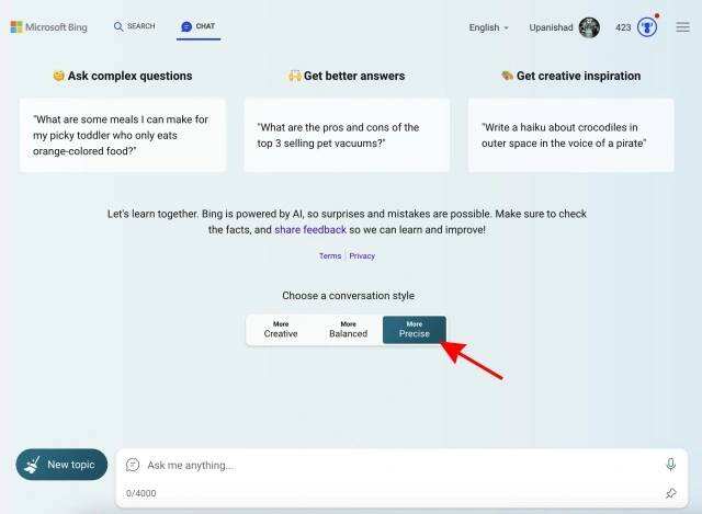 - 现在,选择 “More Precise” 模式。不过,您也可以选择必应上的任何其他模式,因为它们都使用ChatGPT。然后,向必应提出你想要的任何问题,它就会开始为你搜索。